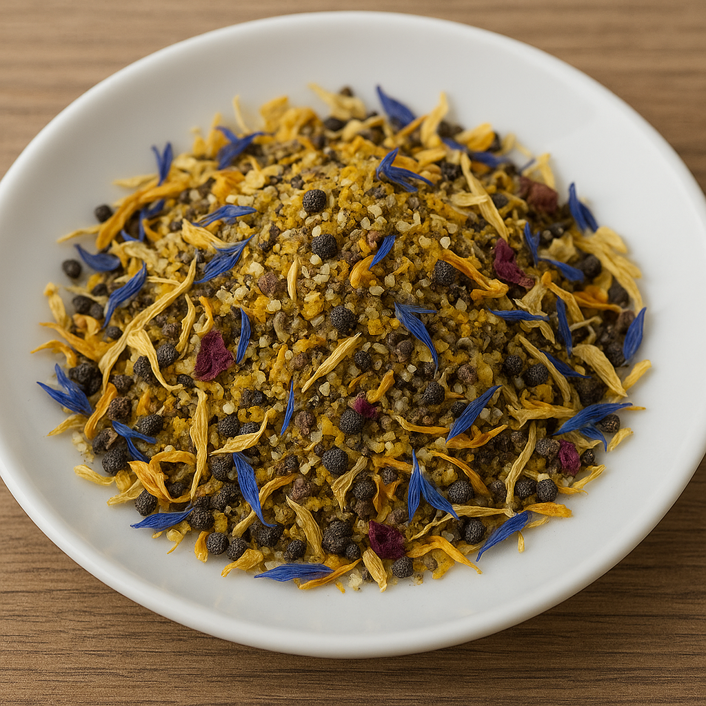 Diese außergewöhnliche Pfeffer-Gewürzzubereitung verbindet fruchtige Frische mit floraler Eleganz: Fein gemahlene Orangenschalen sorgen für eine sonnige Zitrusnote, während Rosenblätter, Korn- und Ringelblumen die Mischung visuell wie geschmacklich veredeln. Curcuma bringt eine milde Würze und ein warmes Goldgelb ein, während schwarzer Pfeffer der Komposition ihren charakteristischen Schärfekick verleiht. Abgerundet mit einem Hauch Zucker, entsteht ein einzigartiges Geschmackserlebnis – aromatisch, floral, fruchtig und würzig zugleich.